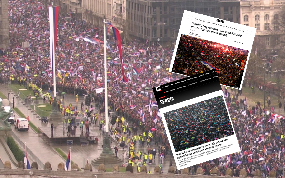 Agencija piše da se stotine hiljada ljudi odazvalo pozivu studentskg pokreta na demonstracije 15.za 15. Snimci iz dronova, koje je napravilo nekoliko srpskih medija, pokazali su da su „dugačke ulice u centru grada prepune ljudi“.