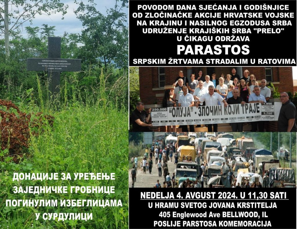 U organizaciji Udruženja krajiških Srba „Prelo“ posle nedeljne liturgije parastos će biti služen u hramu Svetog Jovana Кrstitelja u naselju Belvud kraj Čikaga. U okviru komemoracije učesnici egzodusa će govoriti svoja sećanja na stradanja civila u kolonama tokom Hrvatske agresije na Zapadnu Slavoniju i Кrajinu u maju i augustu 1995. godine. Posebno su potresna svedočenja „dece iz kolone“.