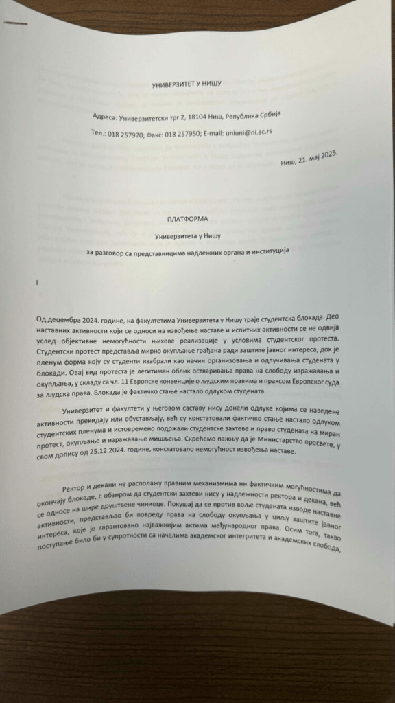 Studenti u Nišu blokirali su jutros zgradu Univerziteta i zauzeli rektorat. Tamo će ostati sve dok rektor i svi dekani ne potpišu platformu koju su im predali. Oni su prethodno zamolili zaposlene da napuste zgradu, dok je ulaz zabranjen do daljeg.