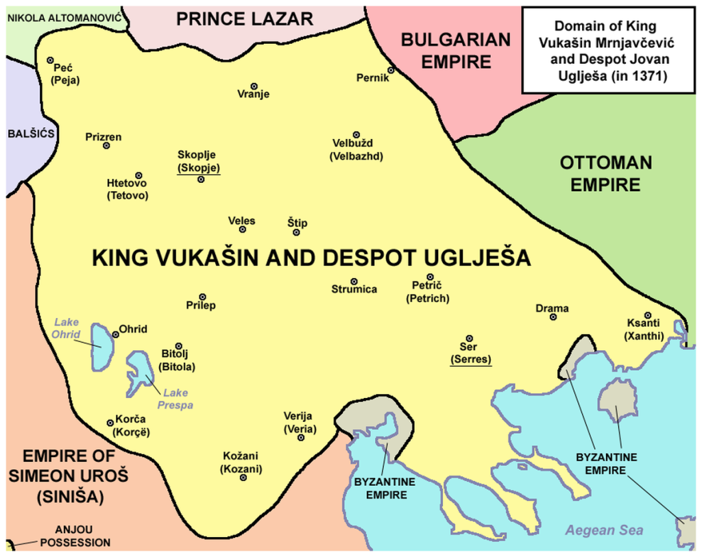 After the death of Tsar Dušan in 1355, the Serbian Empire began to collapse. Its vast territories in Macedonia and Greece were divided by numerous regional lords. Some of them sought independence from the fragile central authority. The strongest among them, the Mrnjavčevićs, Vukašin and Uglješa, ruled territories in modern-day Macedonia. Vukašin proclaimed himself King of “all Serbs and Greeks.”