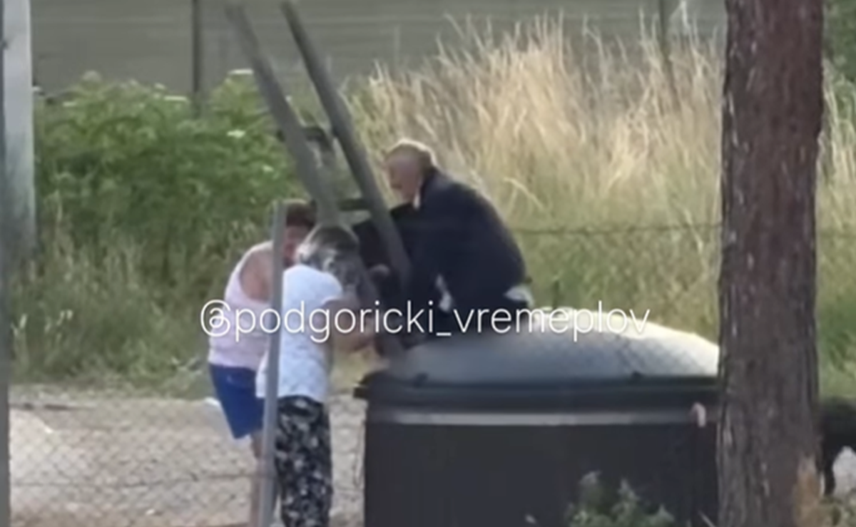 The video, published on the Instagram page “Podgorički vremeplov,” shows an older man placing a tall ladder into an underground container, while two women assist him.