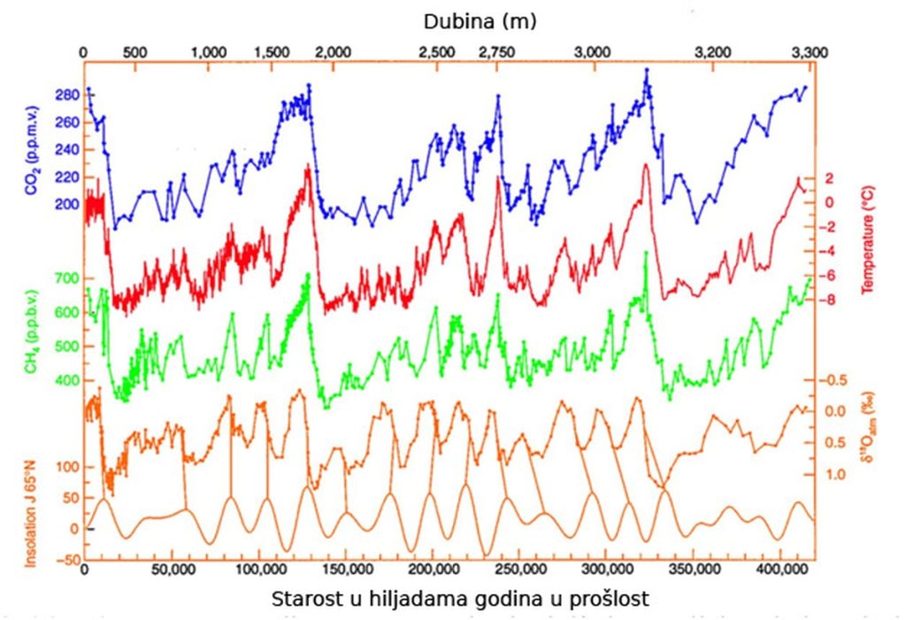 We observe (in the picture) a very good match between the changes in carbon dioxide and methane in the atmosphere and the temperature (glacials and interglacials). Precise measurements of the size of global ice in glacial ice are based most often on deep, sedimentary cores from the ocean floor, or from Arctic, Antarctic ice (ice cores), in which climate changes are recorded by the ratio of oxygen isotopes 16 and 18, the presence of carbon dioxide, methane, and furthermore the presence of dust, remains of living beings (fossils), etc.