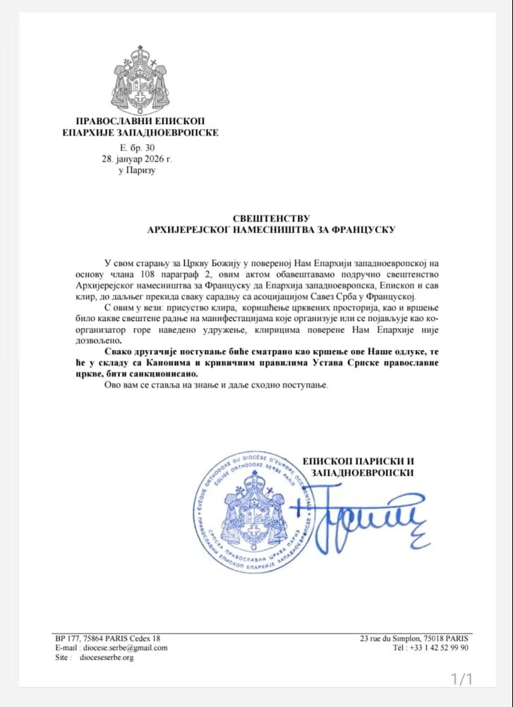 In the act, dated January 28, 2026, in Paris, it is stated that the clergy, the bishop, and all the clerics “until further notice terminate all cooperation with the association Union of Serbs in France,” including attendance at events organized by that association.