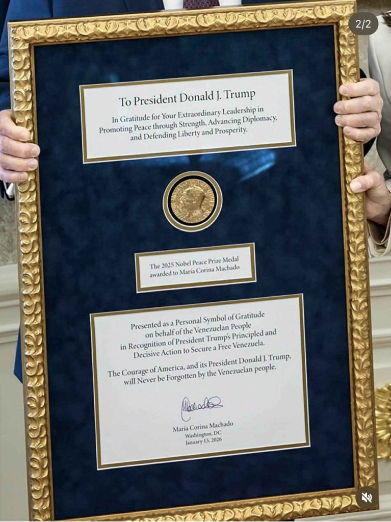 “Two hundred years ago, General (Marquis de) Lafayette gave Simón Bolívar a medal bearing the image of George Washington. Bolívar kept that medal until the end of his life. Two hundred years later, the people of Bolívar return a medal to the heir of Washington — in this case, the Nobel Peace Prize medal — as recognition of his unique dedication to our freedom,” Machado emphasized.