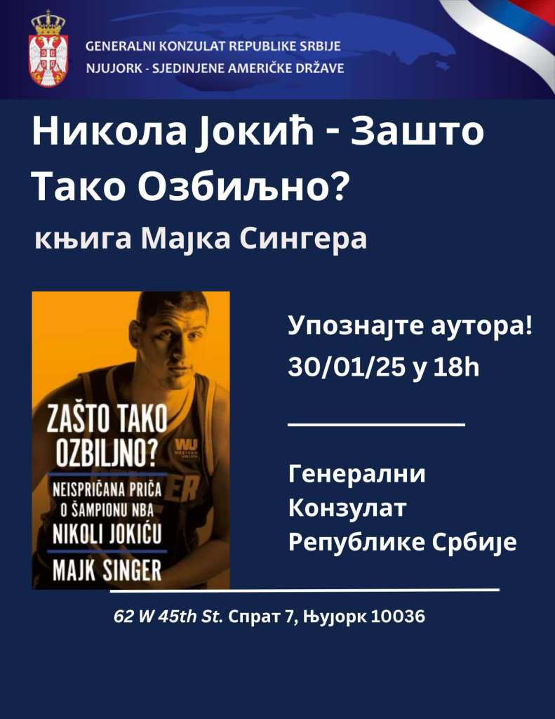 Generalni konzul Republike Srbije u Njujorku Vladimir Božović sa zadovoljstvom je pozvao srpsku dijasporu na promociju knjige o Nikoli Jokiću, istaknutom reprezentativcu Srbije i trostrukom dobitniku MVP nagrade u NBA ligi. Bivši novinar Devera Majk Singer nam u knjizi „Zašto tako ozbiljno?“ otkriva do sada nepoznate detalje iz karijere srpskog asa, ali i brojne doživljaje van terena.