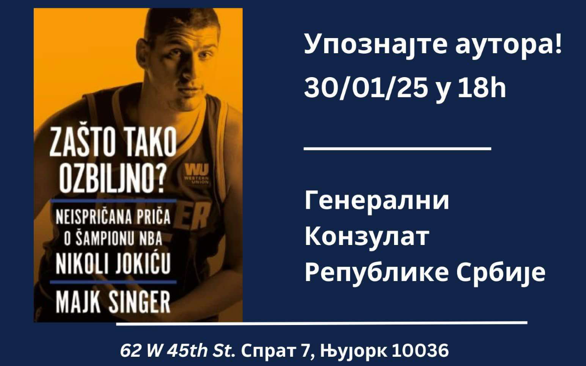 Generalni konzul Republike Srbije u Njujorku Vladimir Božović sa zadovoljstvom je pozvao srpsku dijasporu na promociju knjige o Nikoli Jokiću, istaknutom reprezentativcu Srbije i trostrukom dobitniku MVP nagrade u NBA ligi. Bivši novinar Devera Majk Singer nam u knjizi „Zašto tako ozbiljno?“ otkriva do sada nepoznate detalje iz karijere srpskog asa, ali i brojne doživljaje van terena.