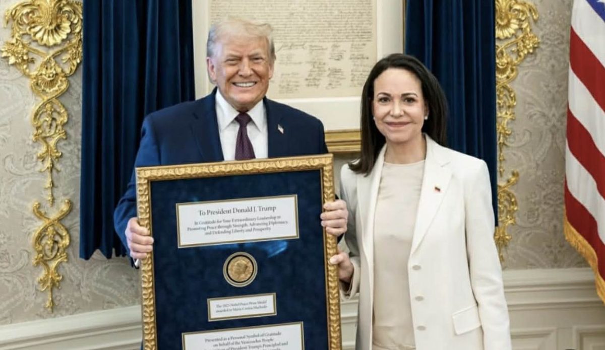 Liderka opozicije u Venecueli Marija Korina Mačado izjavila je danas da je predsedniku SAD Donaldu Trampu uručila Nobelovu nagradu za mir koju je dobila 2025. godine za borbu za demokratiju u Venecueli.