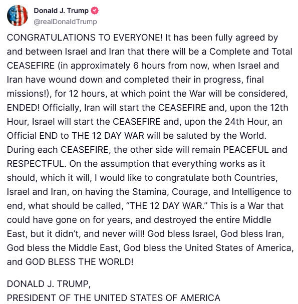 TRAMP OBJAVIO: Izrael i Iran dogovorili prekid vatre za 6 sati, kad završe tekuće akcije! Čestitam svima!