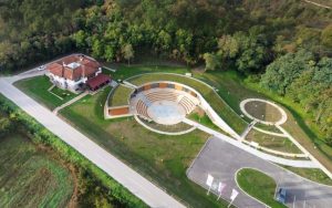 Ispred ove dve sale je prostor amfiteatra, sa 360 sedišta, idealan za izvođenje scenskih igara na otvorenom, na koji se nadovezuje prostor parkirališta za autobuse i automobile, kapaciteta oko stotinu parkirališnih mesta.