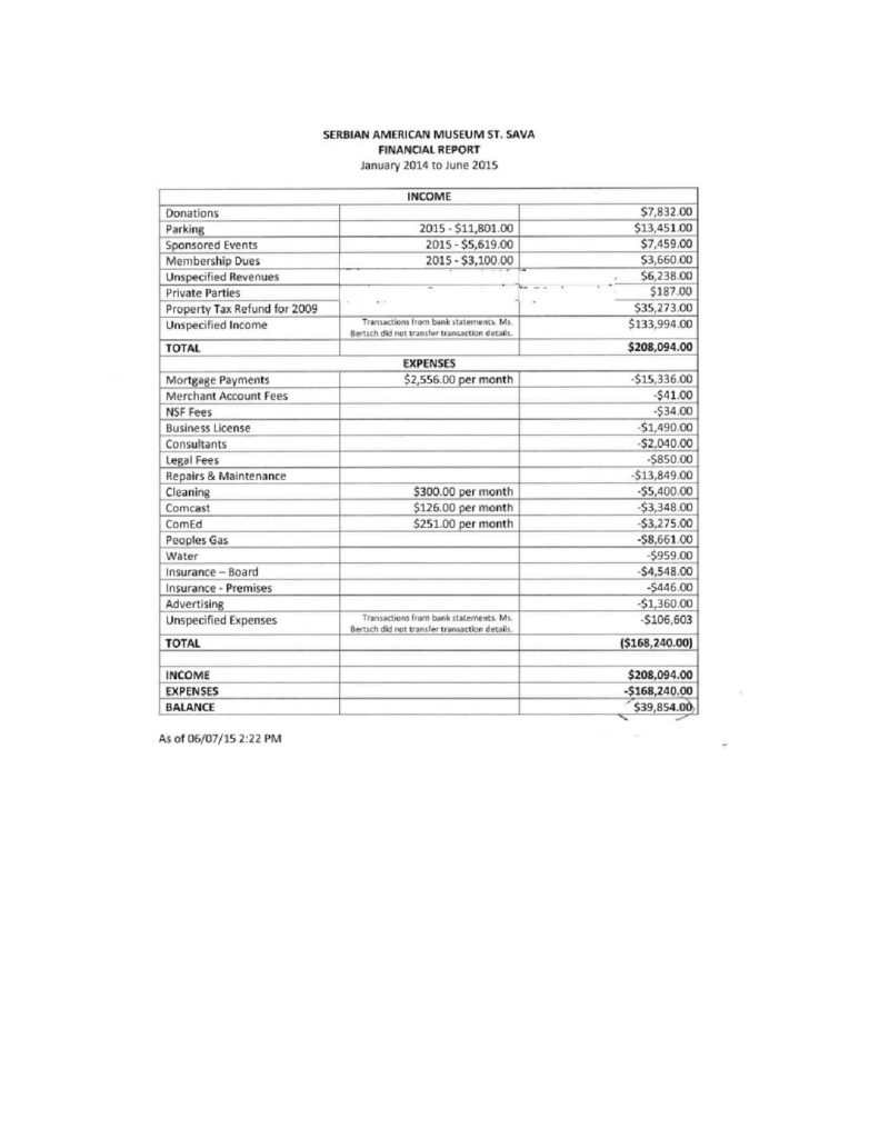 –Ako je dug 2018. godine bio $375,000 kada su isplaćene pomenute kamate, kako je moguće da je dug u 2019 narastao na $450,000?! Pogledajte izvod koji je poslala Banka, tu sve piše. A evo ga i Finansijski izveštaj iz 2015 godine gde se vidi da je prihod te godine bio $208.084. Gde je otišao taj novac? Mogu li Vesna Nobl i gospodin Žika Pavlović da objasne kako su uspeli da dupliraju dug Muzeja za 8 godina njihove vlasti, iako je on u međuvremenu izuzet od poreza, tako da su jedini troškovi tekući računi za struju, vodu…? – pita se Nebojša Radovanović i tvrdi da neće odustati sve dok pomenuti dvojac ne završi u zatvoru zbog svojih mahinacija.