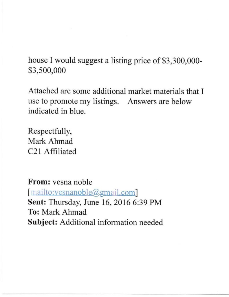 -Na sastanak sam pozvao Marka Ahmata iz kompanije Century 21, koji je u tom trenutku bio treći broker u Americi i prvi u državi Ilinois, čoveka koji ima bogato iskustvo i dugogodišnju uspešnu praksu. Vesna Noble je u izjavi za vaš portal navela da je g. Ahmat ponudio 2,5 miliona$ za Kuću, što nije istina. Cifra je bila 3,5 miliona, o čemu postoji i dokaz, njegov e-mail upućen Muzeju 17.jun 2016 (pogledati Foto-galeriju dole).