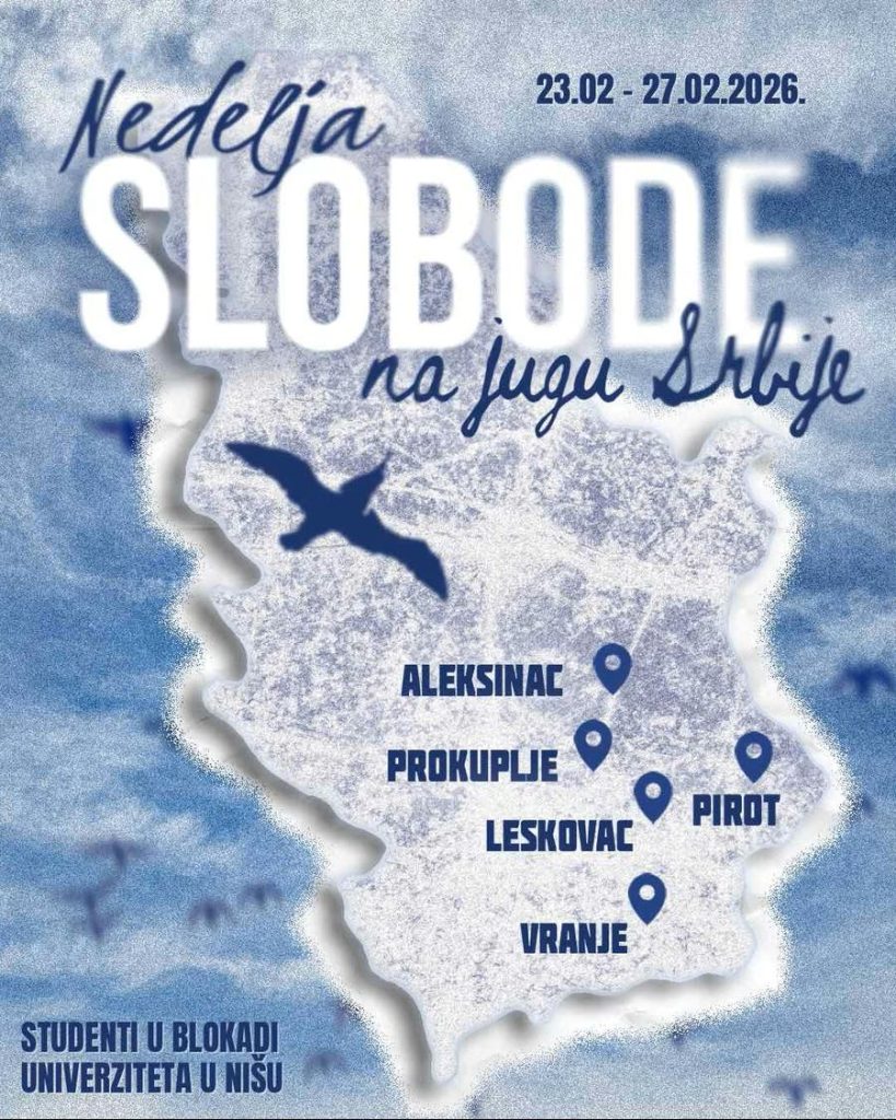 Studenti u blokadi Univerziteta u Nišu najavili su da će u susret velikom studentskom skupu zakazanom za 1. mart u Nišu organizovati seriju tribina u pet gradova juga Srbije pod nazivom „Nedelja slobode na jugu Srbije“.