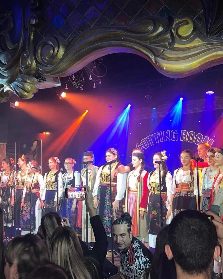 Naime, devojke iz folklorne grupe Drina su svojim božanstvenim glasovima i nastupom oplemenile koncert Sindikata a vrhunac večeri bio je upravo trenutak kada su na sceni sa bendom otpevale pesmu „Veseli se srpski rode“ Danice Crnogorčević, što je ujedno i njihova omiljena. Ovi stihovi podigli su sve na noge, zaorilo se iz stotina grla, pa ke bila milina slušati kako reči: Gračanica, Studenica, Studenica… odzvanjaju u centru svetske metropole.