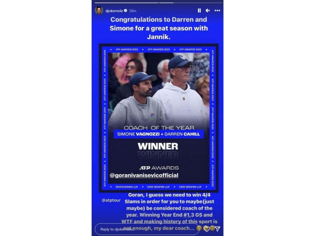 Zbog toga se Novak Đoković oglasio i na Instagramu, pa je uz čestitke timu Janiku Sinera „pecnuo“ ATP koji ga je opet ignorisao: „Gorane, čini mi se da moramo da osvojimo četiri grend slema da bi ti možda, samo možda, bio razmatran za najboljeg trenera godine. Moj dragi treneru, izgleda da završavanje godine na prvom mestu ATP, tri grend slema, Završni masters i ispisivanje istorije nisu dovoljni“, naglasio je besni Novak.