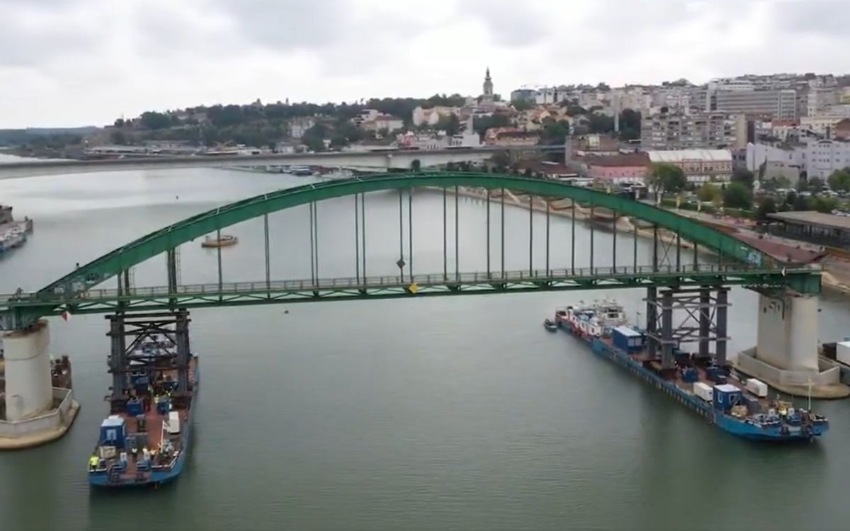 Zelena lučna konstrukcija beogradskog Starog savskog mosta uklonjena je u prepodnevnim satima, sa postamenta na reci Savi gde je stajao poslednjih 83 godine. Nakon centralnog dela mosta, biće uklonjena i dva stuba te konstrukcije. pic.twitter.com/GfQzs9Qrgy
