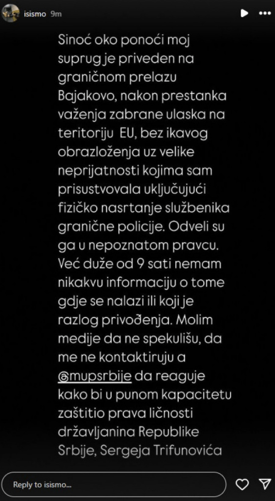 „Sinoć oko ponoći moj suprug je priveden na graničnom prelazu Bajakovo, nakon prestanka važenja zabrane ulaska na teritoriju EU, bez ikakvog obrazloženja uz velike neprijatnosti kojima sam prisustvovala uključujući fizičko nasrtanje službenika granične policije. Odveli su ga u nepoznatom pravcu. Već duže od 9 sati nemam nikakvu informaciju o tome gde se nalazi ili koji je razlog privođenja“, napisala je Isidora na Instagramu.