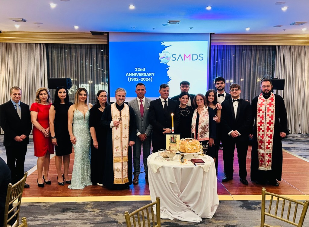 Slava je, kako i dolikuje, počela bogosluženjem koga je obavio sveštenik Aleksandar Petrović, paroh crkve Svetog Stefana Dečanskog iz Čikaga, uz sasluživanhe i pojanje oca Dragana Arsića, direktora Alademije “Sveti Sava”. Slavski kolač su prelomili članovi uprave SAMDS na čelu sa predsednikom Dr.Nebojšom Kneževićem i domaćinom slave, doktorkom Vesnom Simić, oftalmologom.