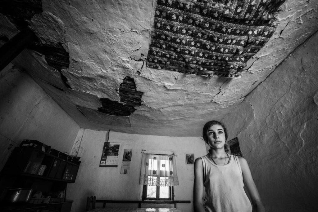 Pored Lutke, sramežljivo nam prilaze Dušan (13) i Aleksandra (11) koji pokazuju da uđemo u kuću. Dugačka pravougaona soba sa zemljanim podom i istrošenim pokućstvom predstavlja i kuhinju i dnevni boravak. Plafon pun krpljenih rupa, koji izgleda kao da će svakog trenutka da popusti, izaziva nemir i strepnju šta može da se desi u bliskoj budućnosti.