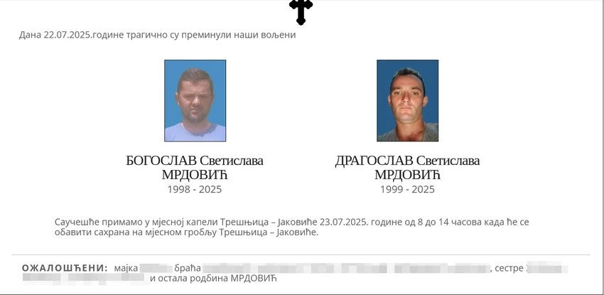 Ovo su rođena braća Bogoslav (27) i Dragoslav (26) Mrdović koji su nastradali danas dok su se kupali u reci Tari. Nezapamćena tragedija dogodila se u mestu Slatina kod Mojkovca