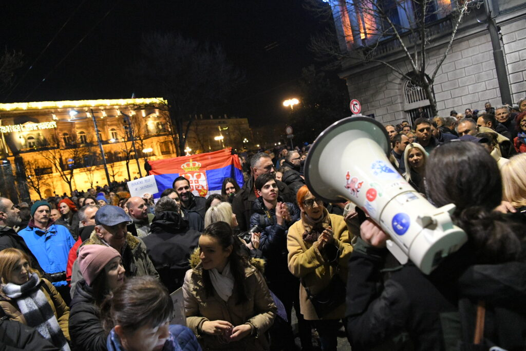 Okupljeni ispred RIK-a skandiraju „vratite nam glasove“ i pozivaju predstavnike ove institucije da „izađu napolje“, a sa megafona su se mogle čuti i afere vlasti poput Jovanjice i Krušika.
