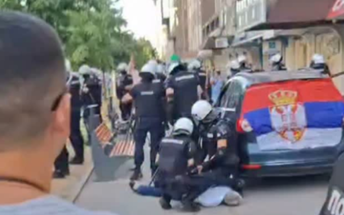 Prostorije sada obezbeđuje kordon policije, a iza njih na kolovozu stoji parkiran auto sa srpskom zastavom u kom je bio Miliomir Jaćimović.