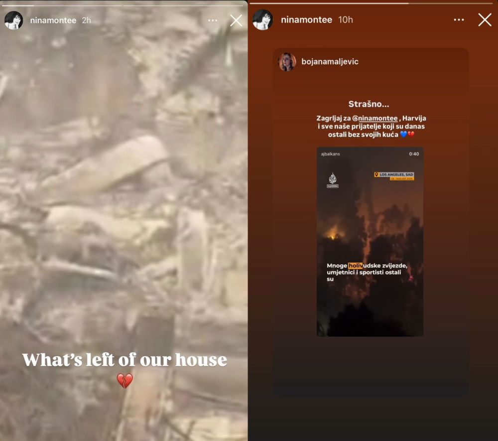 Bojana Maljević na svom Instagram profilu napisala je da šalje zagrljaj Nini i svim prijateljima u Los Anđelesu koji su ostali bez domova usled požara.