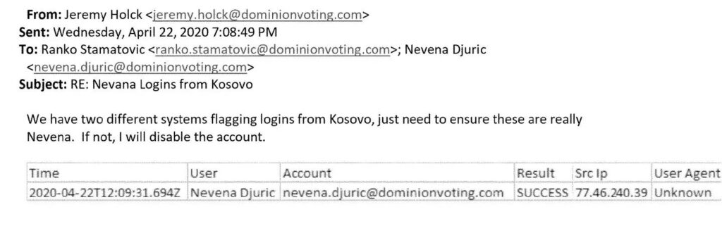 U ovim imejlovima postoji više nego dovoljno razloga za zabrinutost da su Srbi koji su radili za Dominion Voting Sistems imali pristup softveru američke elektronske mašine za glasanje i osetljivim informacijama o glasačima.
