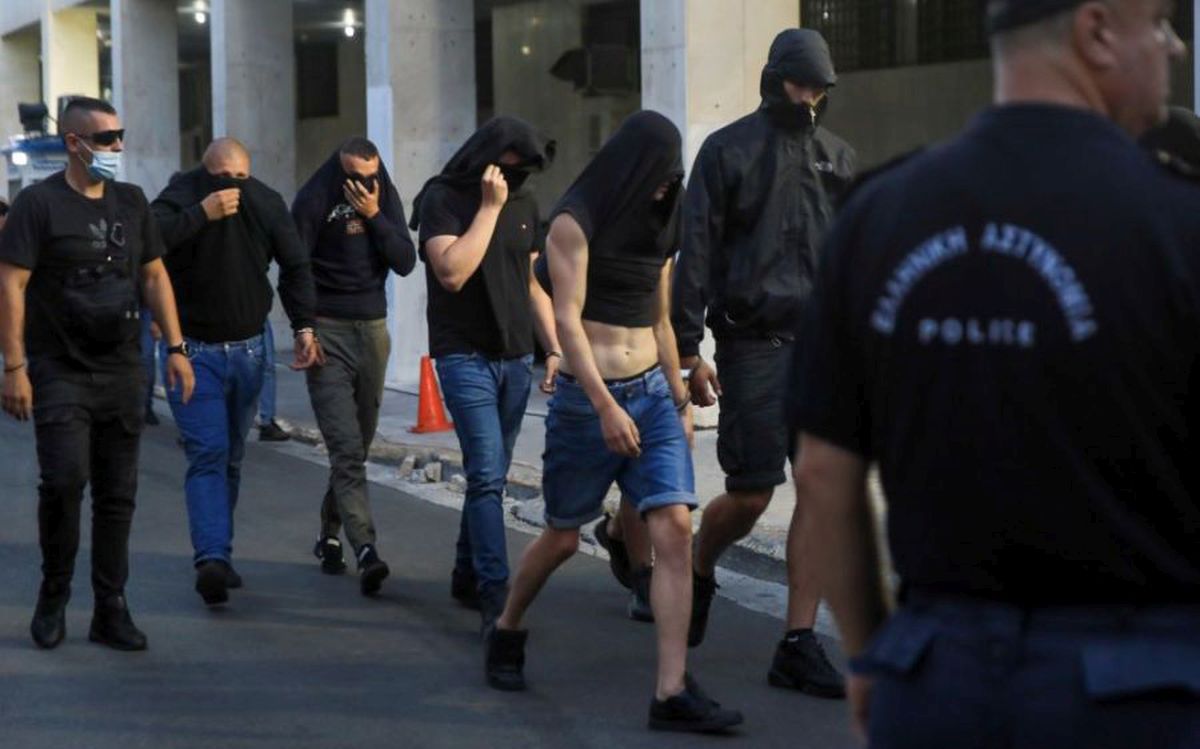 Nakon puštanja nekih od njih, ostala su 94, a oni su privedeni tužiocu, saopštila je agencija ANA. Sada su objavljene fotografije navijača koji dolaze na sud, gde ih policija prevozi autobusima.