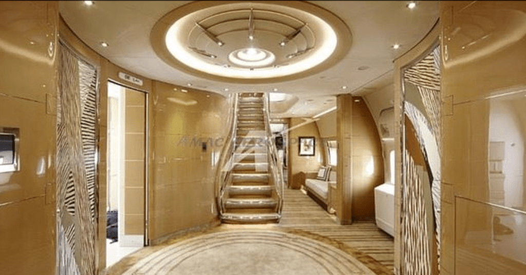Avion je opremljen spavaćom sobom, salonima, konferencijskim prostorijama, kupatilima obloženim mermerom i velikim stepeništem, prenosi Tanjug.