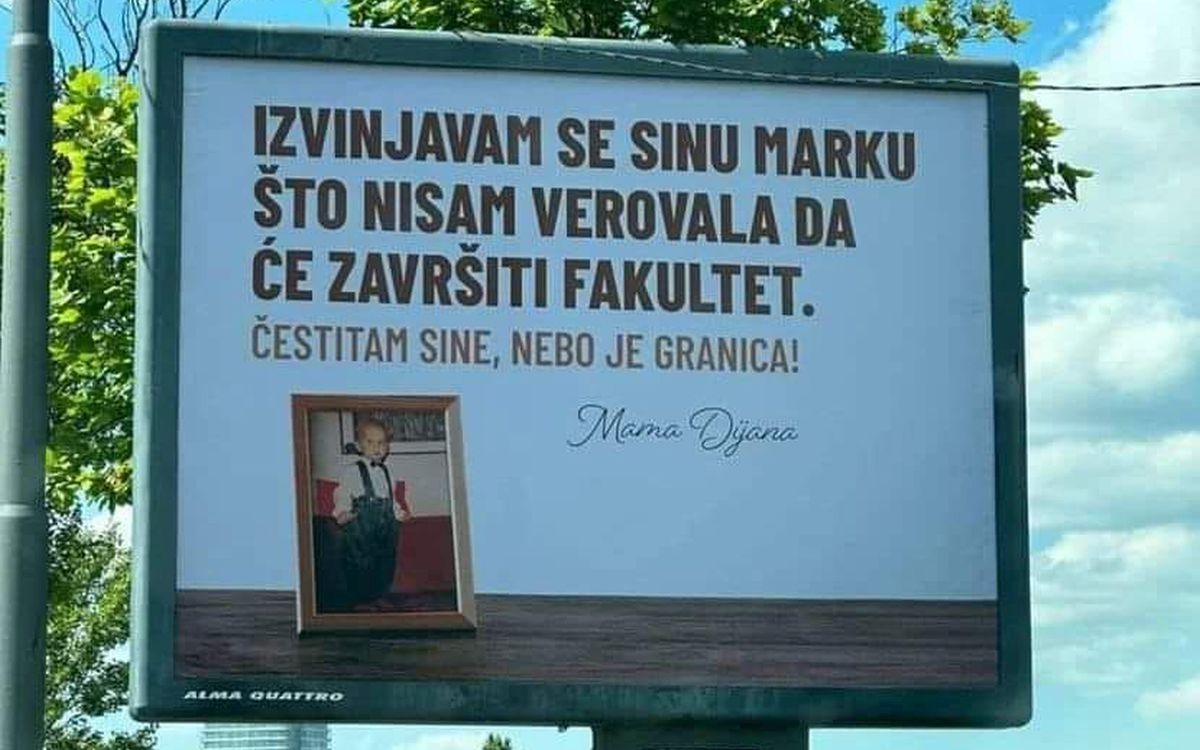 Čitav Beograd zabrujao je kad se društvenim mrežama zalaufala fotografija bilborda na kojem se vidi kako ponosna mama priznaje svoju roditeljsku grešku – da nije verovala da će joj sin završiti fakultet.