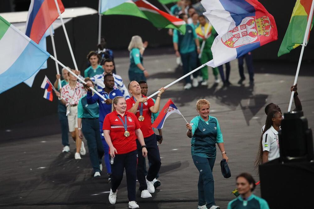 Osvajači zlatnih medalja, naši strelci Zorana Arunović i Damir Mikec, u defileu sportista uneli su na stadion srpsku trobojku.