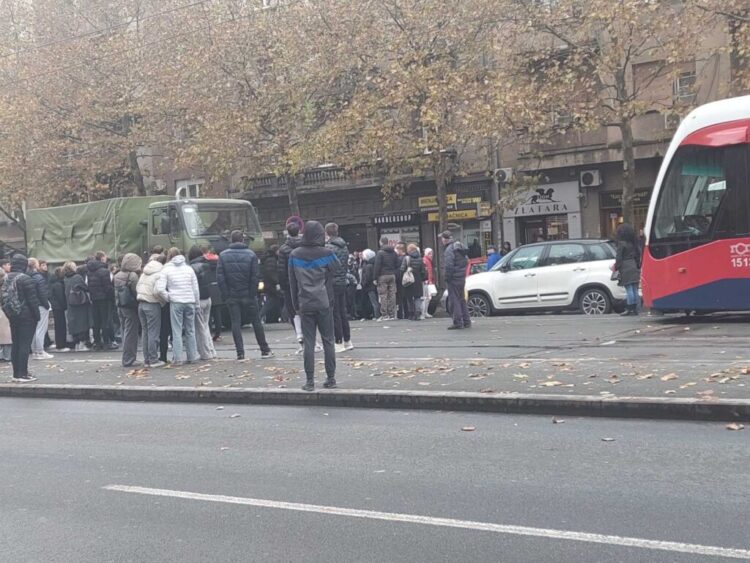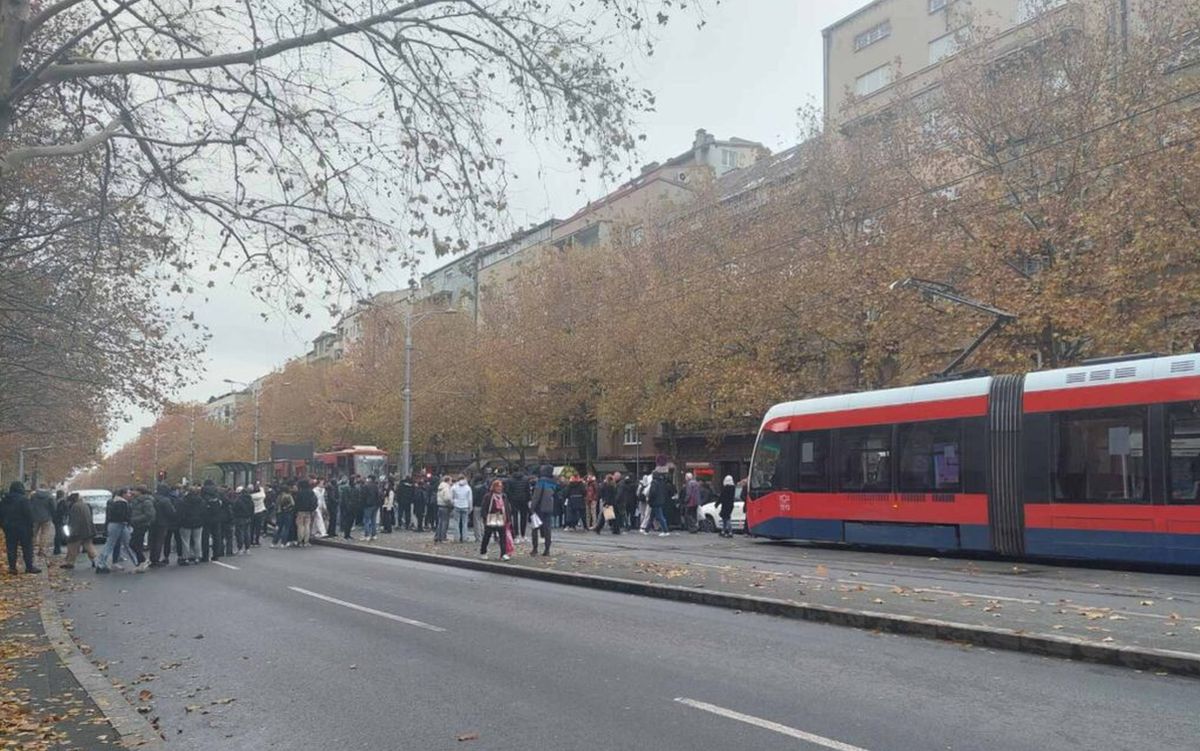 Učenici Šeste beogradske gimnazije blokirali su saobraćaj u Bulevaru Kralja Aleksandra, u blizini raskrsnice sa Batutuvom ulicom.