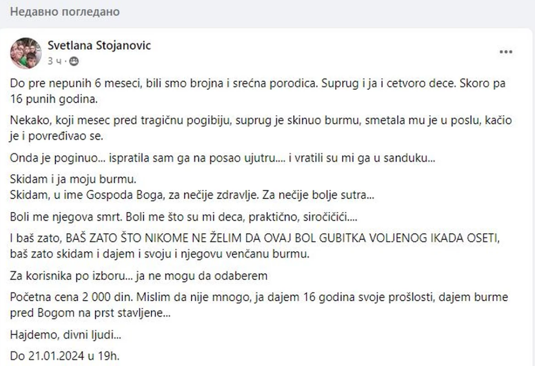 Kako je objasnila, njihove burme stavila na licitaciju u Fejsbuk grupi „Budi human – Humanitarne licitacije“, jer je od dana smrti njenog muža, burma asocira na veliku tragediju koju su ona i njena deca preživeli.