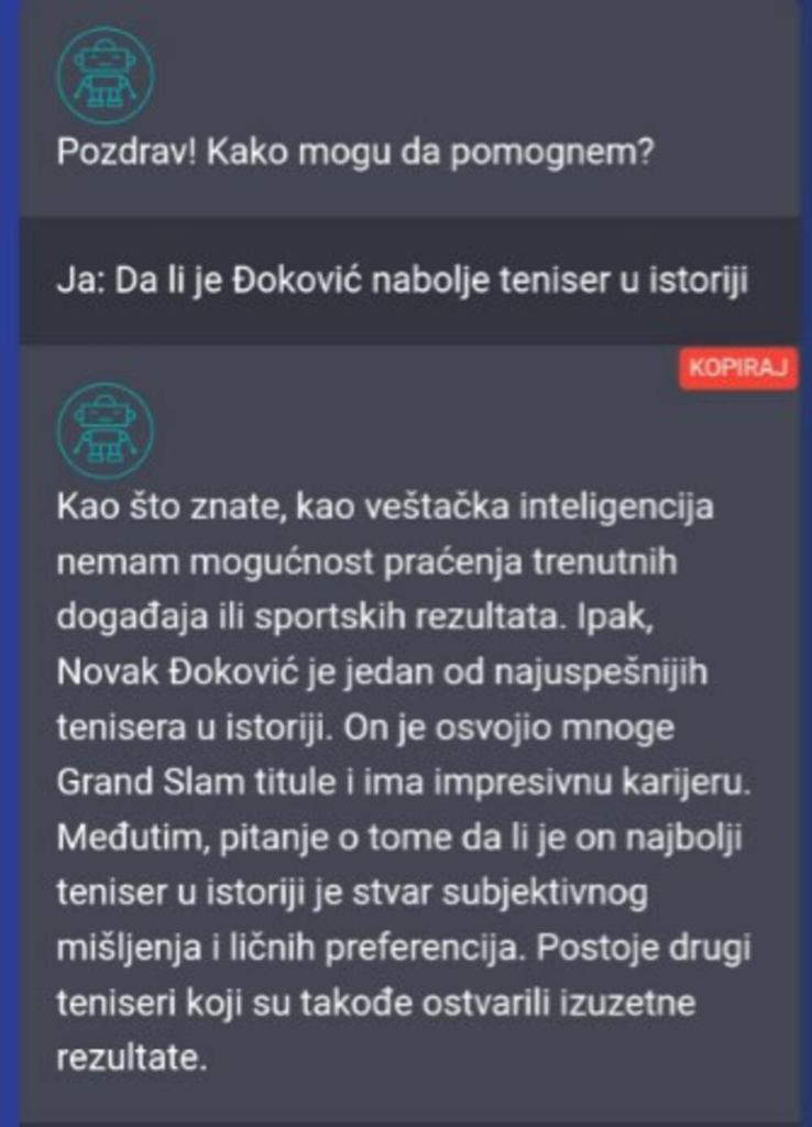 Takođe, pitali smo veštačku inteligenciju i da li je Đoković najbolji teniser u istoriji, a odgovor je sledeći: