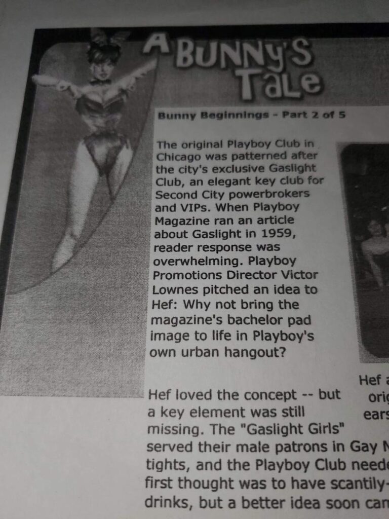Te iste 1953. godine, kada je otvoren klub, još jedan mladić rodom iz Čikaga, Hju Hefner, uradio je nešto podjednako neobično i uzbudljivo za to vreme – objavio je prvi Plejboj, magazin u kome su žene pokazivale više nego što je to bilo uobičajeno. Baš kao i u “Gaslightu”.
